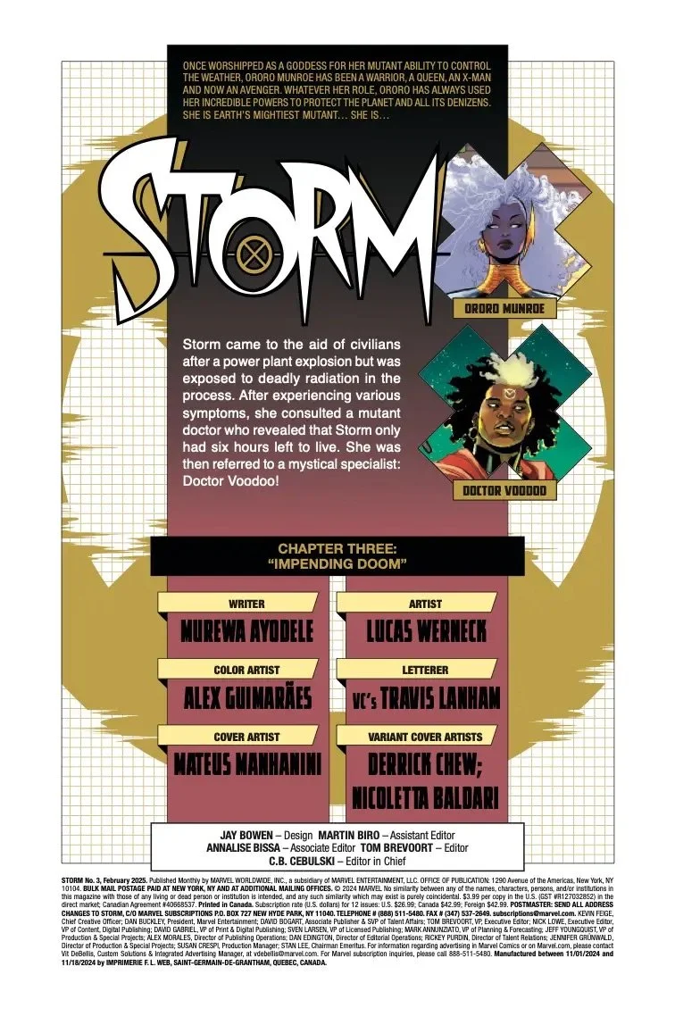 GUEST-STARRING THE UNCANNY X-MEN! STORM finds her way to NEW ORLEANS with DOCTOR VOODOO. The cost of VOODOO's medical treatment is the loss of STORM's powers for seven days. STORM seeks refuge with her former teammates, the UNCANNY X-MEN, but it doesn't turn out to be the relaxing holiday she thought it would be. A secret that aches the heart is born, and it sends STORM into the hands of DOOM.