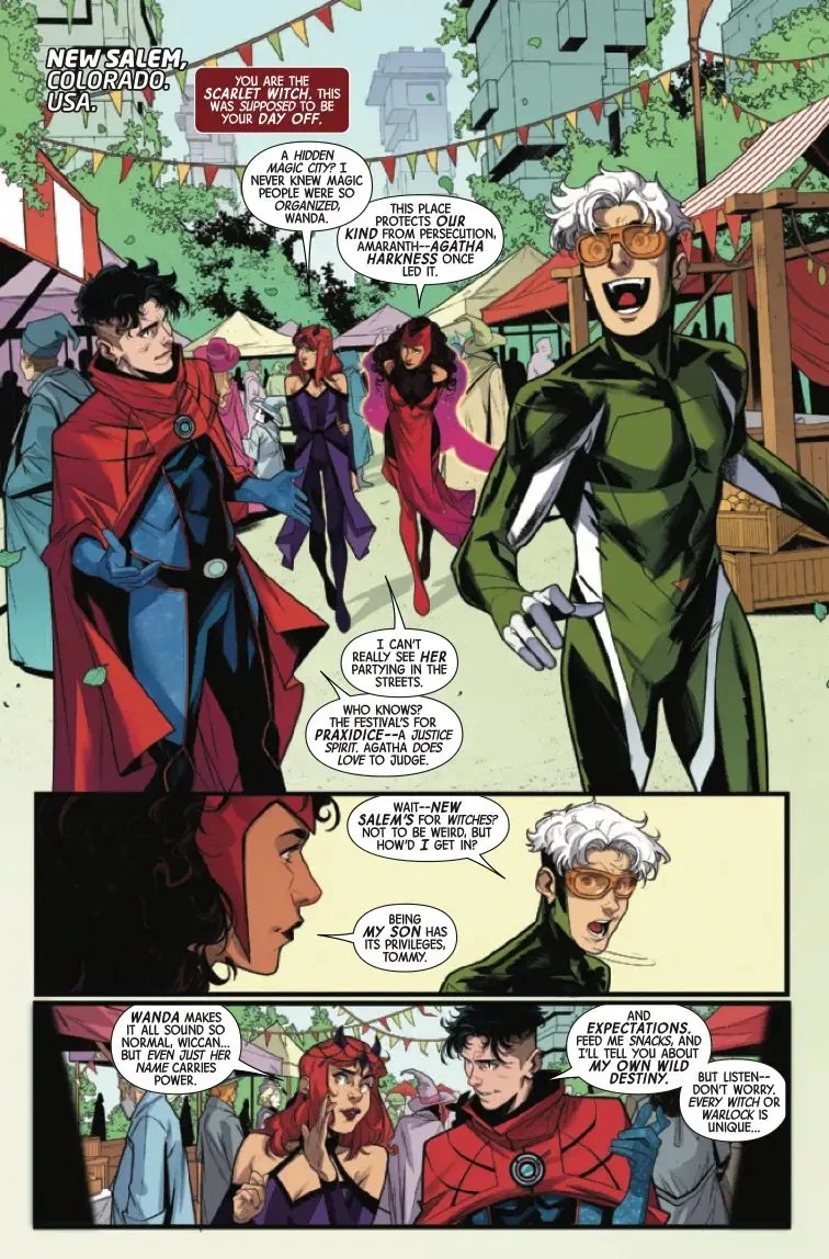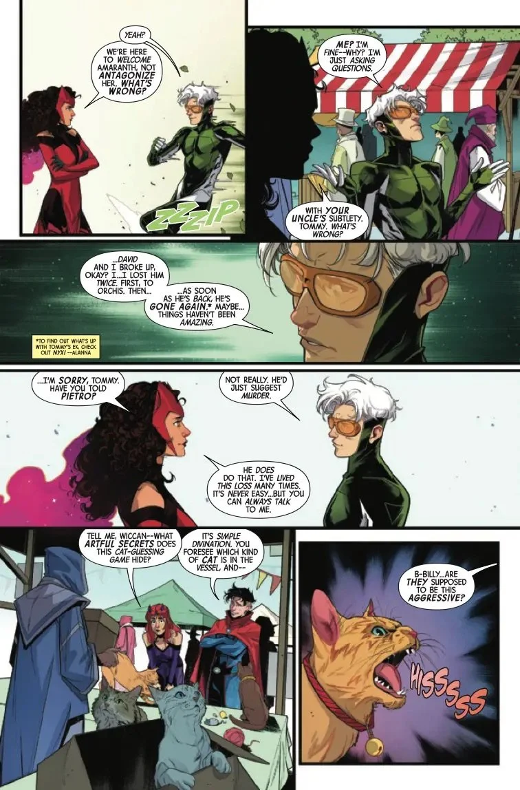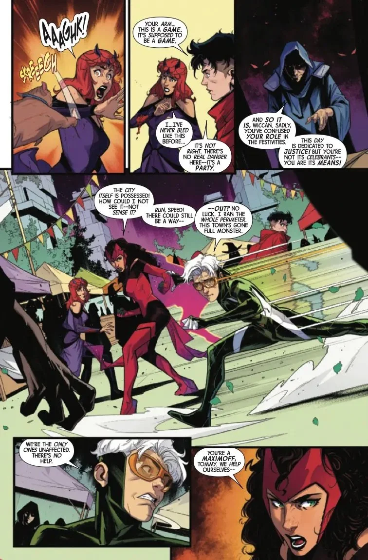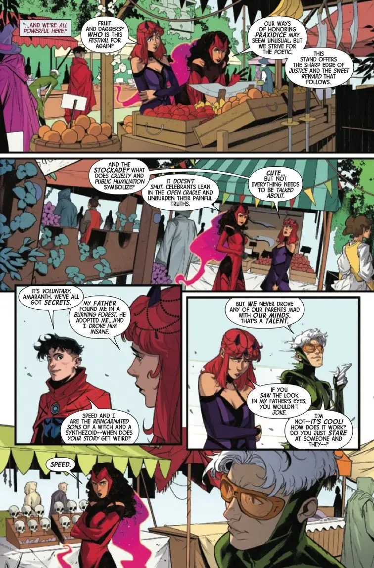 FAMILY COMES FIRST?! When the Scarlet Witch, Wiccan, Speed and Amaranth become trapped in a torturous carnival fun house, Wanda is faced with a choice: save her children or her mysterious new pupil! But as Amaranth's powers come to light, the real question may be who is saving who...?