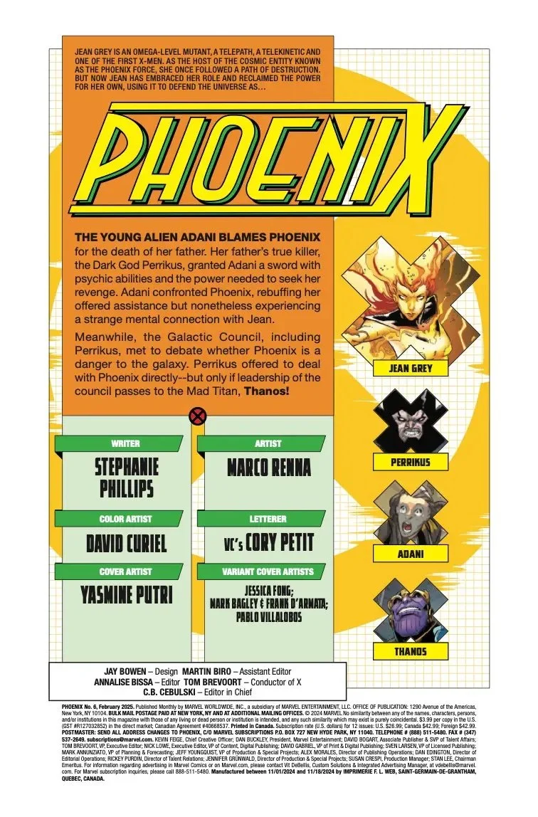 • To have a hope of victory, PHOENIX will need to reach out - beyond the limits of her own powers - and find allies to take a stand against the Mad Titan!