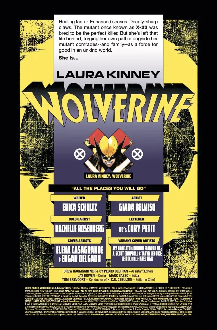 THE ULTIMATE MUTANT DEFENSE! WOLVERINE takes the fight to those who stand as enemies of mutantkind! LAURA KINNEY was bred to be the ultimate assassin as X-23. She's long left that life behind, but as she encounters mutants being forced to use their powers against their will, WOLVERINE takes it upon herself to right these wrongs - no matter who stands in her way! Dynamic scripter Erica Schultz (HALLOWS' EVE, X-23: DEADLY REGENESIS) and rising-star artist Giada Belviso (BLOOD HUNTERS, MS. MARVEL ANNUAL) bring Wolverine on her first mission abroad in the From the Ashes era, as Laura takes the fight to mutant oppressors wherever they may hide!