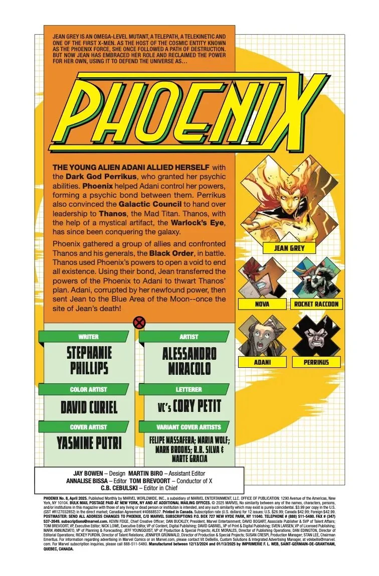 PHOENIX's battle with THANOS and the BLACK ORDER came down to a critical decision - a moment of trust at the limits of Jean Grey's incredible mind that has left her in incredible danger, fighting for the fate of the Phoenix Force. Meanwhile, her enemies have become more powerful than ever - as PERRIKUS' alliance with ADANI grows to include the evil DARK GODS!
