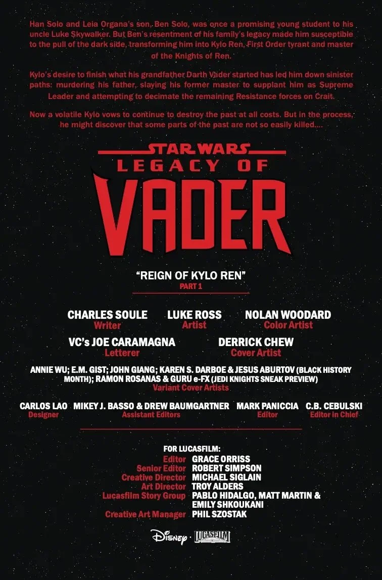 DARTH VADER'S SHADOW EXTENDS INTO...THE RISE OF THE FIRST ORDER! The reign of SUPREME LEADER KYLO REN begins! Kylo's dark obsession leads him to MUSTAFAR! What secrets does FORTRESS VADER hold for the young tyrant? And what face from the past will guide him on his quest?