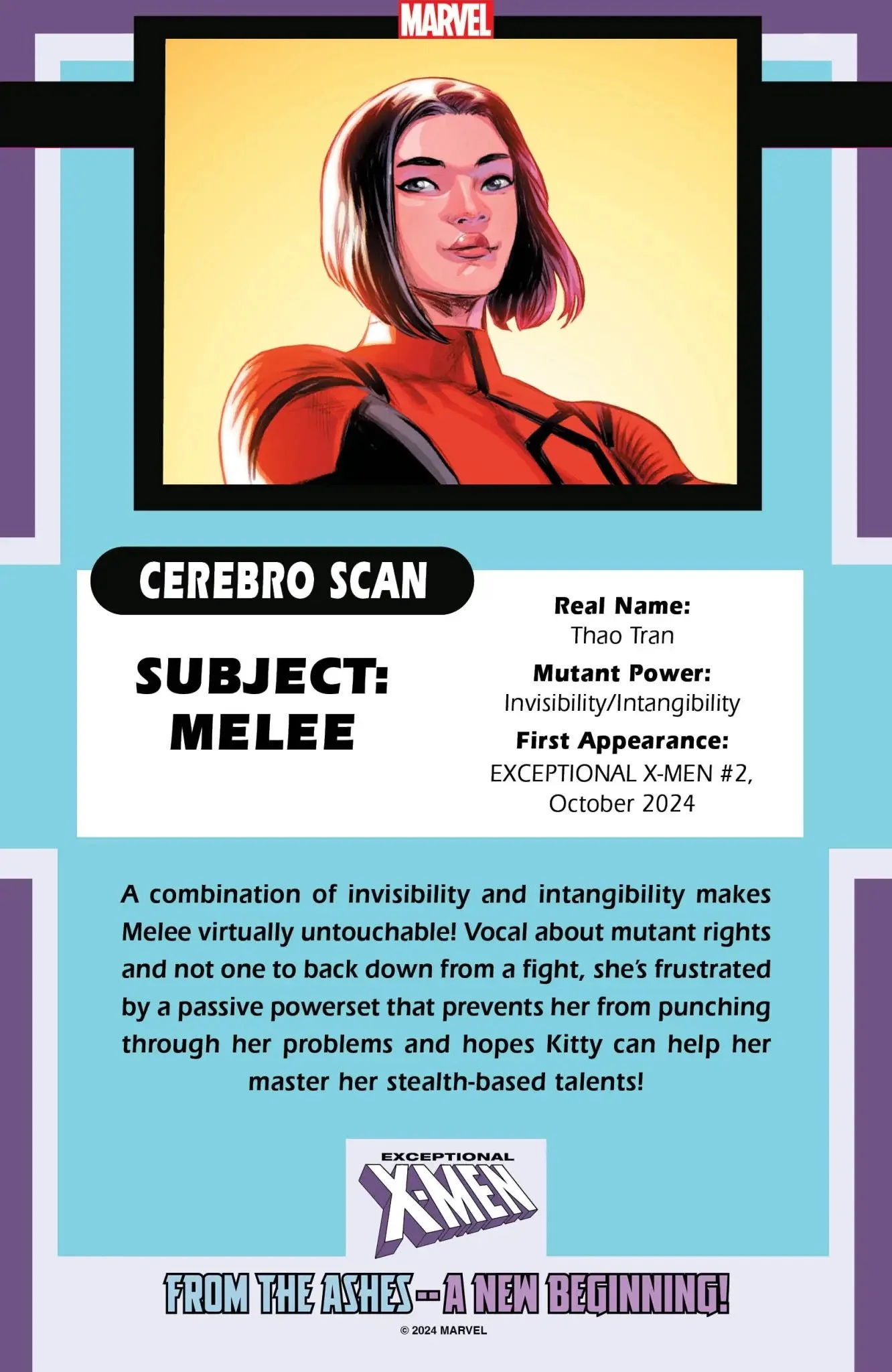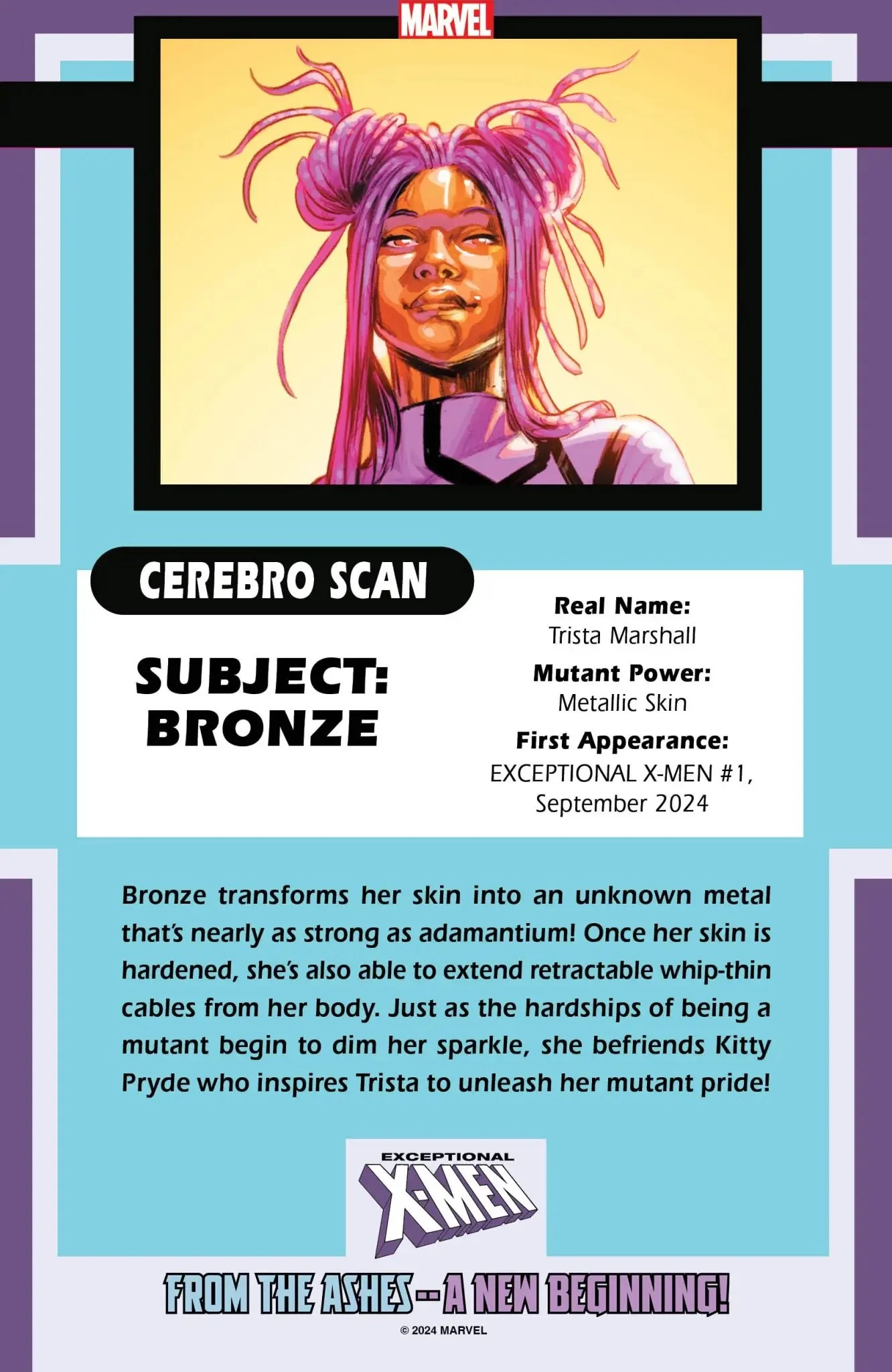 Marvel provided a bit more info on Bronze, Melee, & Axo — the 3 new mutants who will debut in Exceptional X-Men #1 by Eve L. Ewing & Carmen Carnero when the series debuts this September. Check out their new character cards below!