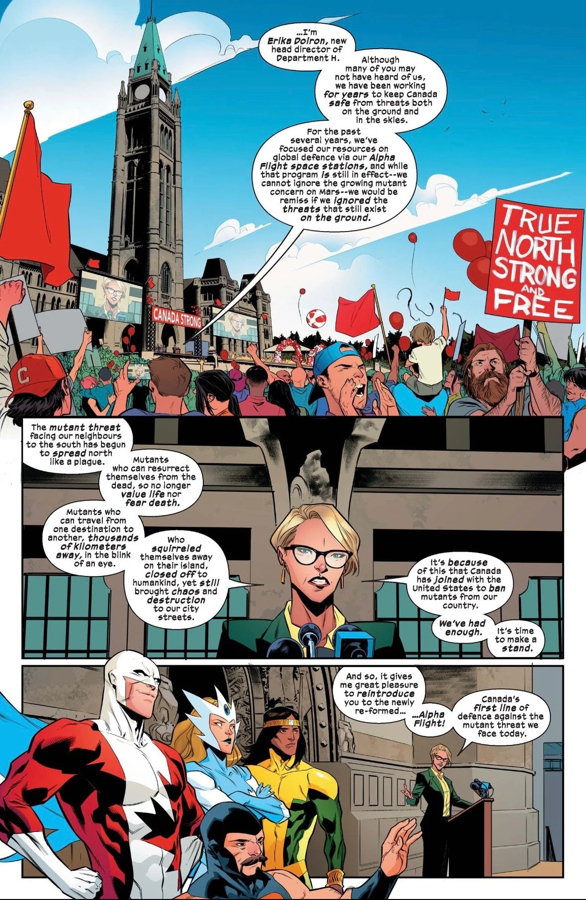 The mutant-less lineup of Guardian, Snowbird, Shaman, and Puck are introduced as Canada’s strategic response to keeping the country safe from the mutant threat hysteria fueled by Orchis. It’s revealed that Canada actually has a program to create their own army of sentinels with the help of Roger Bochs Jr. and the Alpha Flight team is merely the face of the program to create a sense of goodwill with the nation’s population. However, the team “fails” their first mission when a team mutant former members of Alpha Flight, Northstar, Aurora, and Nemesis, along with Daken (who now goes by Fang), show up and “save” the rogue mutant. You’ll notice I’m using quotations here as I’m trying to avoid spoiling the surprise twist at the end — you’ll need to read the issue to find out!
