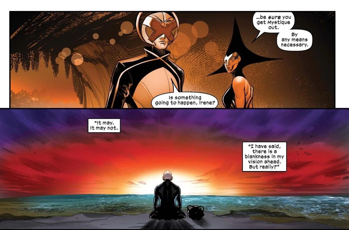 As the main cover of this issue indicates, one of the Quiet Council members we spend time with is Krakoa’s last remaining mutant inhabitant, Charles Xavier. Via flashbacks the ORCHIS attack interspersed with images of an unshaven, present-day Xavier, Gillen reveals Destiny had warned him that something may happen at the Gala and to ensure Mystique’s safety if they did.