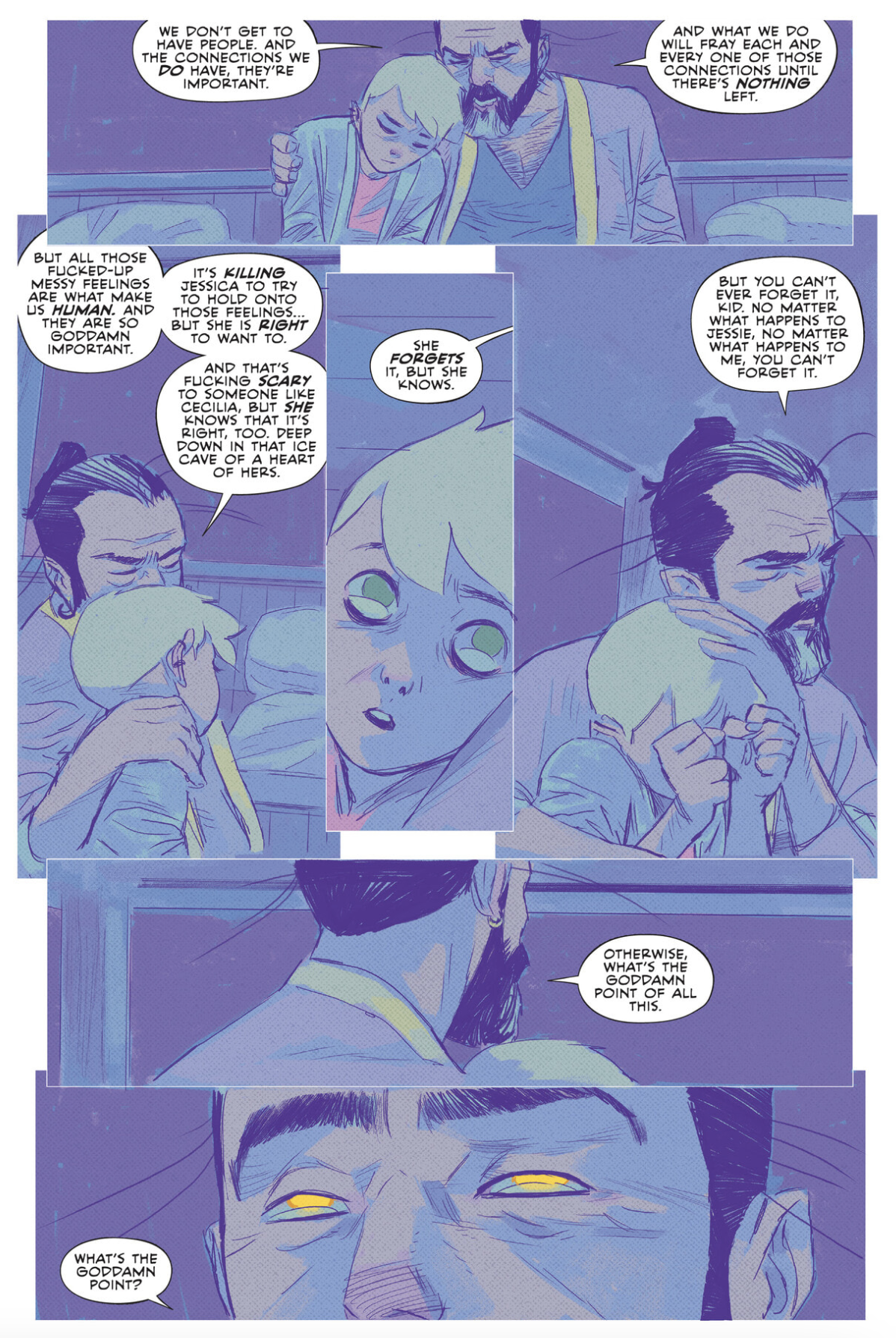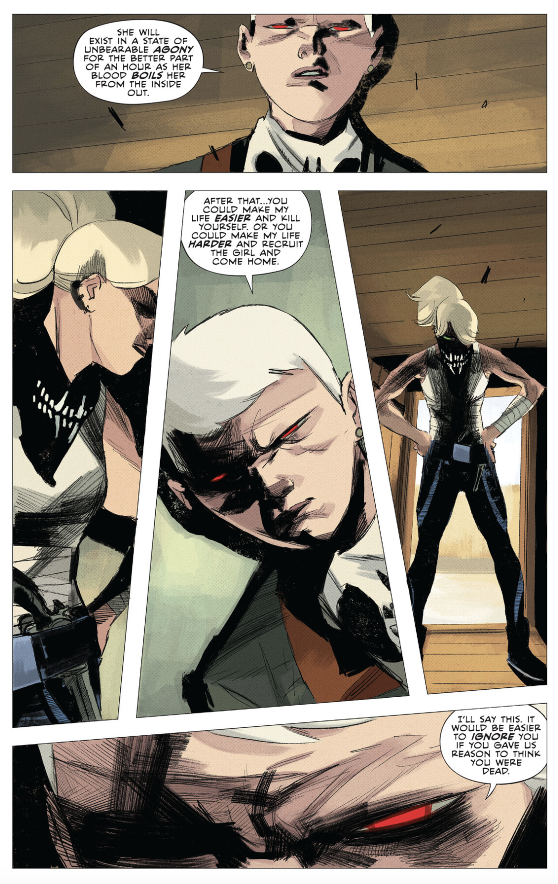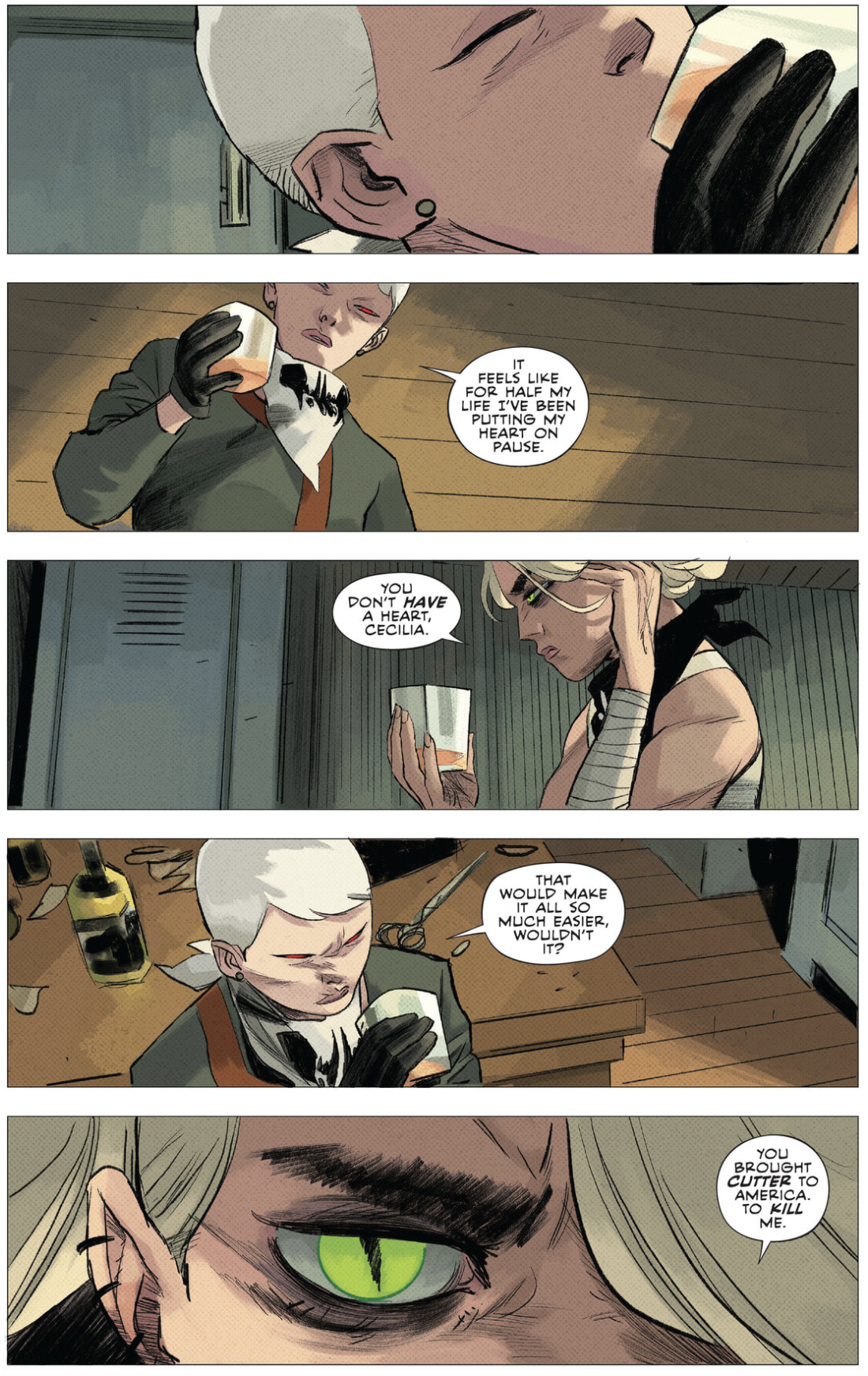 The dialogue-heavy issue didn’t give the creative team a lot to work with. There’s only so many ways you can make a conversation between two people interesting. And even then, it was a pretty lackluster visual experience. Most SIKTC issues take place at night or in darker settings where shadows are natural, but this issue happen mostly during the day and Werther Dell'Edera takes the shading to an extreme in this issue. The end result is some awkward panels where the shading and brighter than normal color palette from Miquel Muerto don’t complement one another.