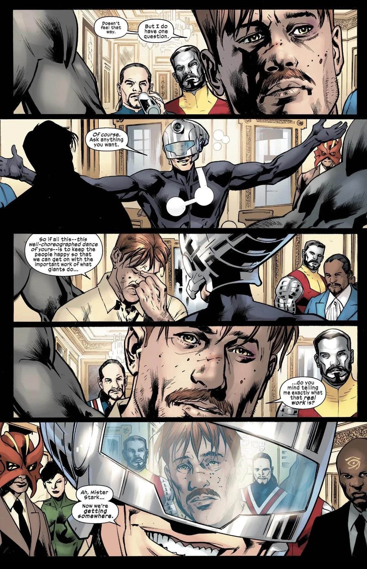 These dynamics unfold throughout the issue as Howard Stark, embodying the reader throughout the process, is brought into the inner circle of world leaders. He’s apprehensive as he learns more and we get some clues through a conversation between him and Tony, but Hickman doesn’t offer a clear indication as to what Howard plans to do with his new knowledge. As Tony pleads with him to bring down The Maker, Howard reminds him not to mistake “right and wrong for good and evil.” I actually prefer this approach as Howard’s perspective on the current situation is so fascinating and mimics the duality presented here.