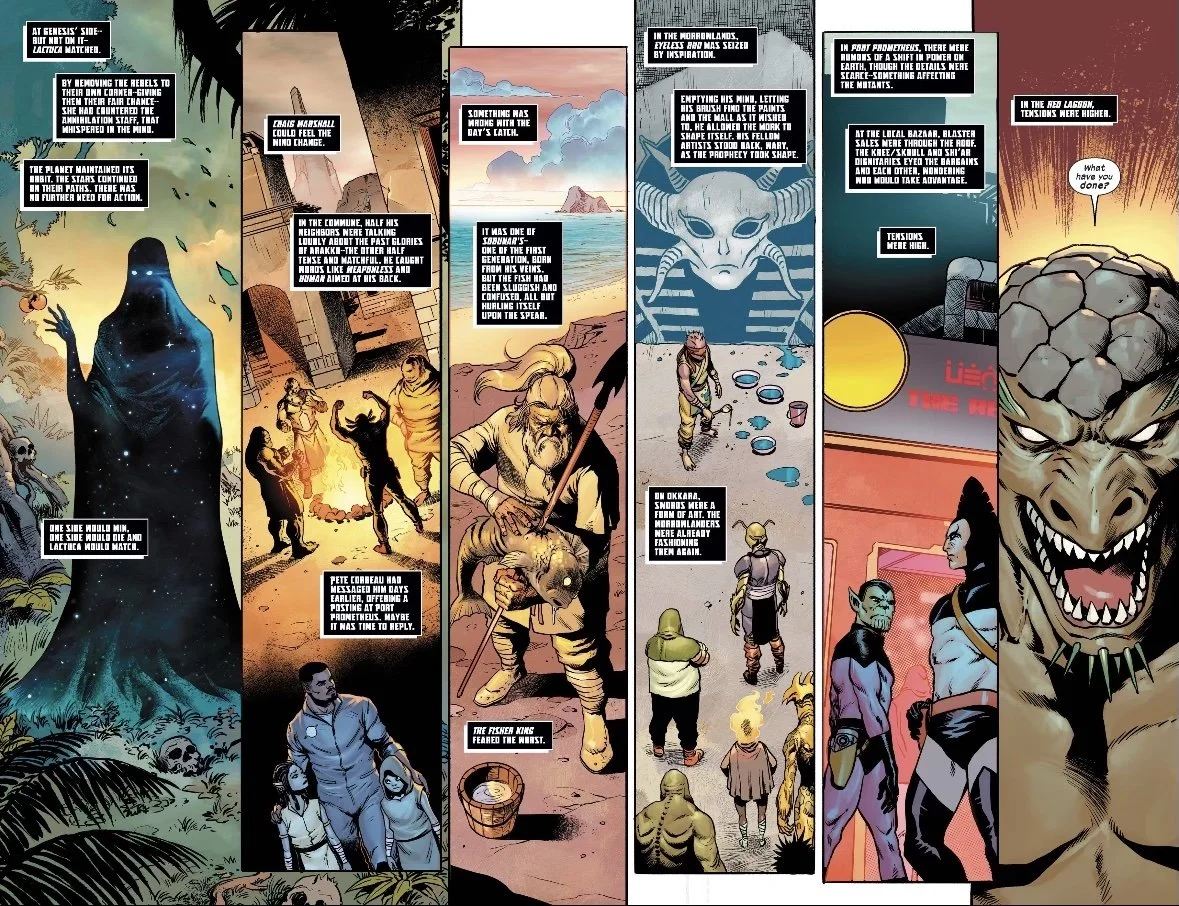The book opens with two scenes showing the opposing sides of the Genesis War. The first few panels show Genesis brought the dead planet back to life, kicking off a propaganda machine that creates dividing lines between inhabitants across every inch of Arakko. We also see Roberto/Sunspot returning to the Red Lagoon in a state of despair, bringing news of the ORCHIS invasion and it’s incalculable mutant casualties. Storm processes the news and wonders if Genesis returning and the ORCHIS invasion were coordinated. Whether they were or not, she realizes she needs to respond with a show of force and announces that Arakko must go to war. We then get a helpful data page recapping which parts of Arakko support either Genesis or Storm, which ends up coming in handy later in the book, before we’re immediately thrust into battle.