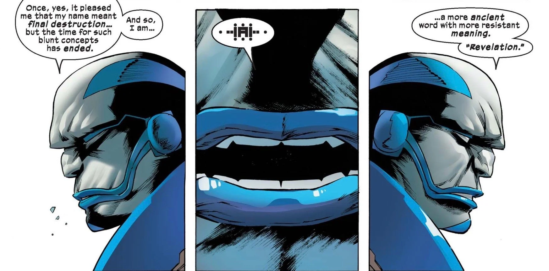 Unseen in comics since the aforementioned ‘X of Swords’ event, Apocalypse, or “A” if you need a refresher, takes center stage in what can best be described as a philosophical reflection on what the meaning of strength is. In a tongue in cheek moment, we learn that Apocalypse’s name really meant Revelation, but it has been bastardized over the course of centuries due to those who grew to fear him. This discrepancy in the meaning of his name is rooted in real-world etymology, as the Greek word ‘apokalypsis’ literally means revelation.